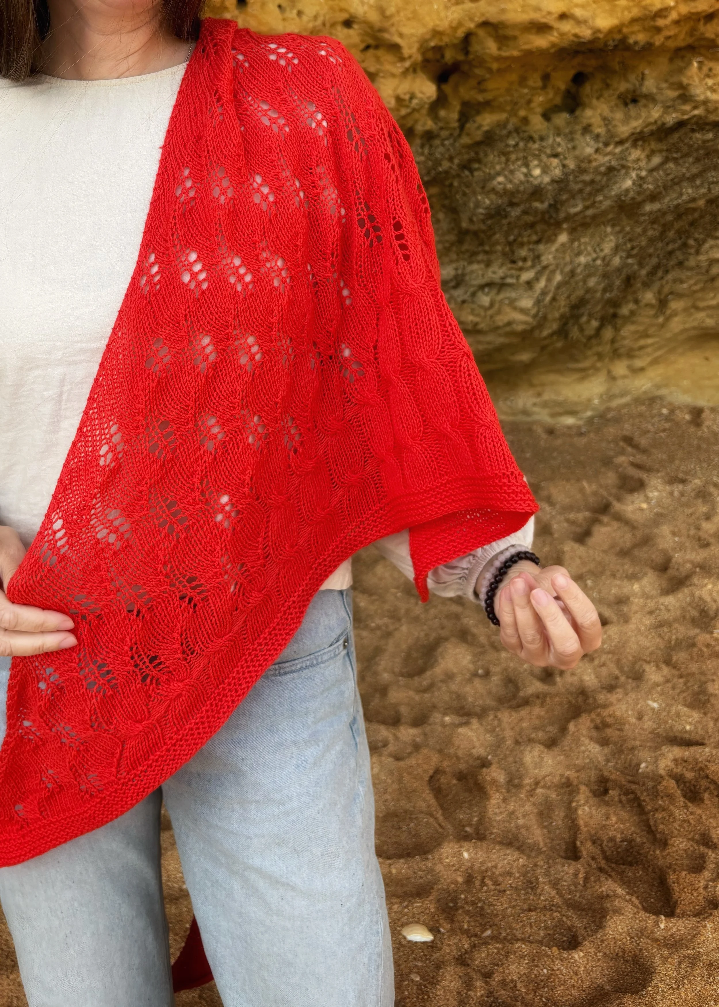 The Fire shawl is worked diagonally, from one tip to the opposite edge. Increases are made on each RS row. The design has a relaxed lace pattern, like sparks flying in the air, and staggered cable columns. All easy yet addictive knitting – perfect for mindful knitting sessions or while watching your favourite shows.
